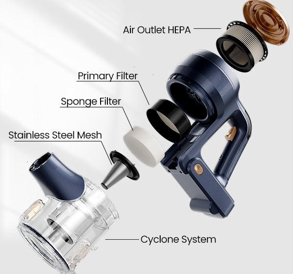 The advanced whole-machine five-layer filtration system traps 99.99% of microscopic dust particles as small as 0.3 microns and releases purified air.