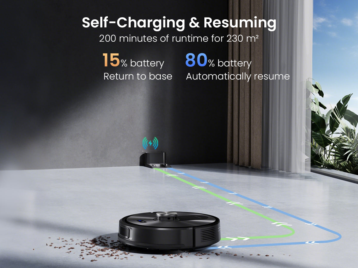 Automatically recharges at 15% and resumes at 80%, ensuring the full cleaning task is completed without supervision.