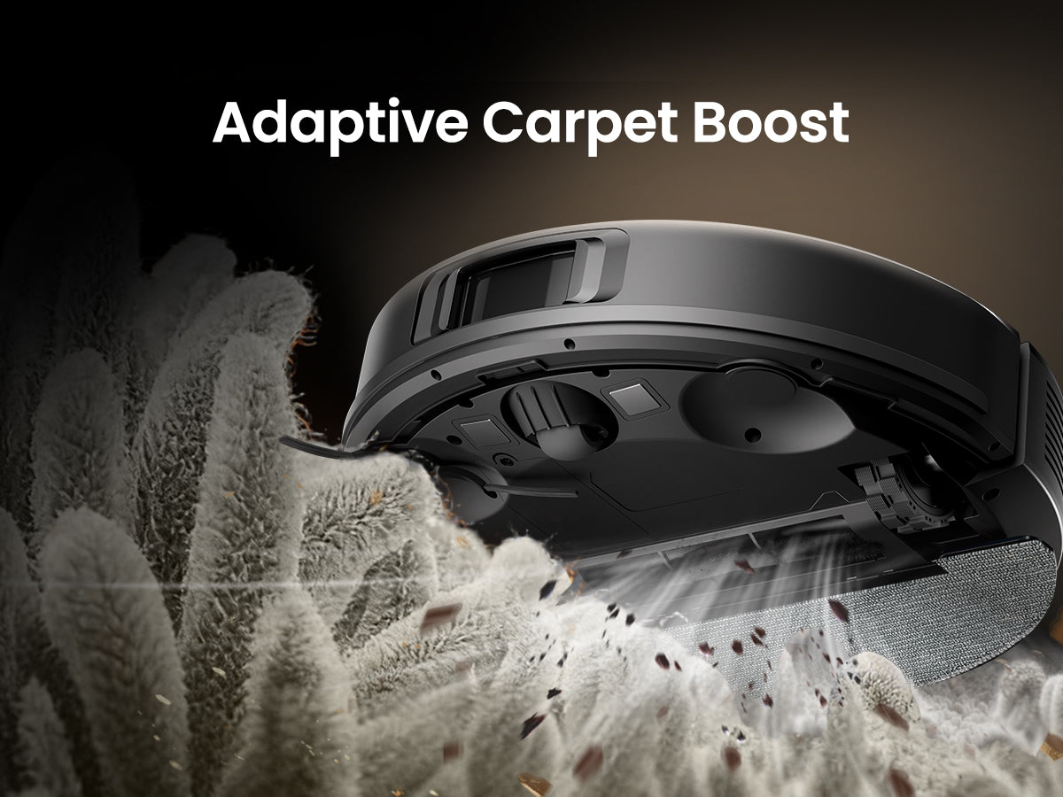 Proscenic Q20 Plus aumenta automáticamente la succión en las alfombras, lo que ayuda a eliminar el polvo incrustado y el pelo de las mascotas de manera más efectiva.