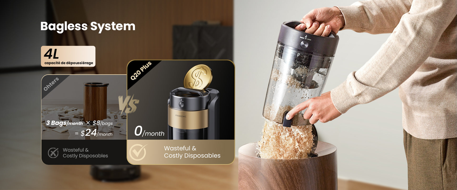Respetuoso con el medio ambiente, el sistema de vaciado automático sin bolsa de 4 litros permite Proscenic Q20 Plus para recolectar desechos por hasta dos meses, ahorrando tiempo, reduciendo el mantenimiento y eliminando la necesidad de bolsas desechables para el polvo.