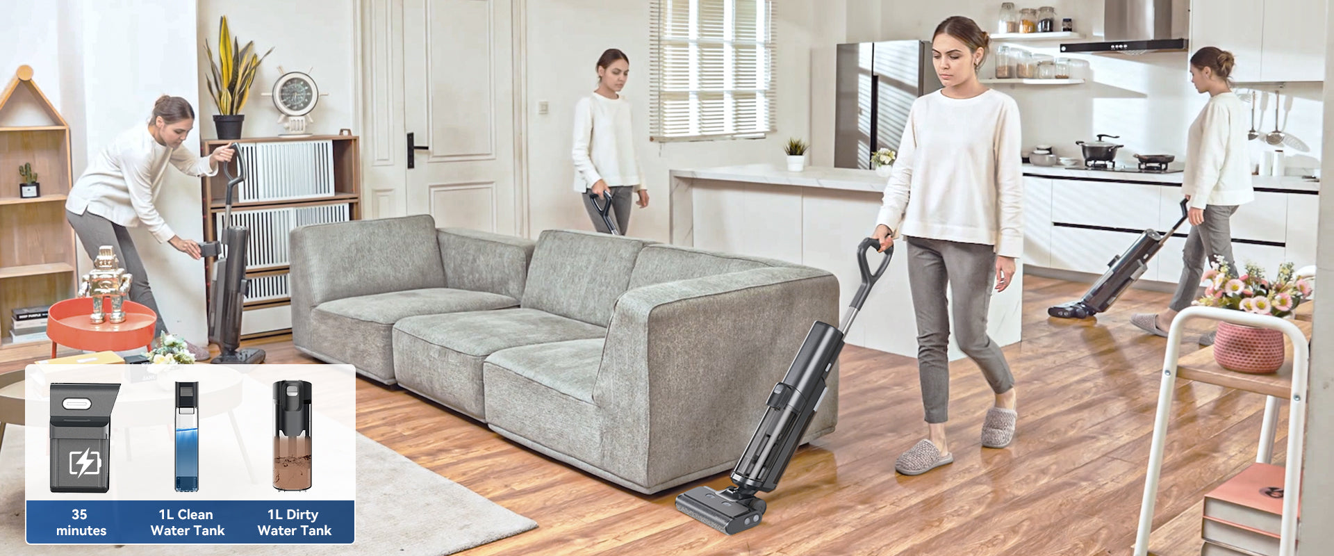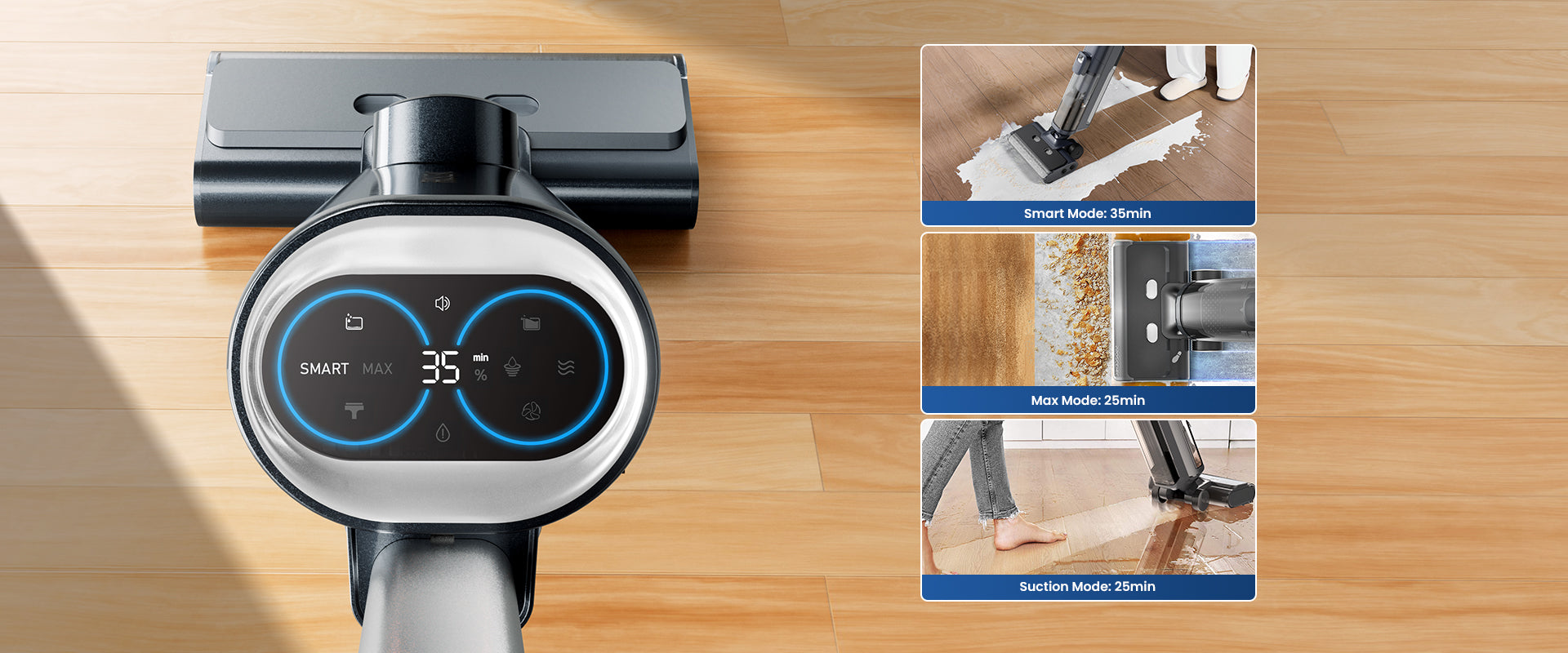 The detachable 6×2,500 mAh battery pack delivers up to 35 minutes of runtime. With a 1L clean water tank and a 1L dirty water tank, it can clean up to 120 ㎡ without interruption.