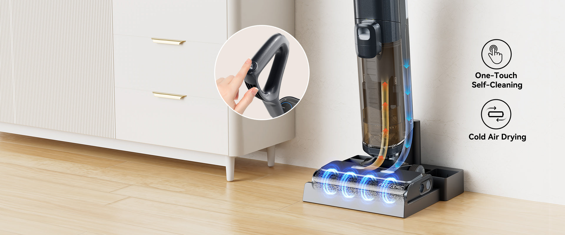 With just a single press of a button, the roller brush and inner tube are thoroughly cleaned. After cleaning, centrifugal air drying effectively removes water from the roller brush, ensuring it stays hygienic and odor-free.
