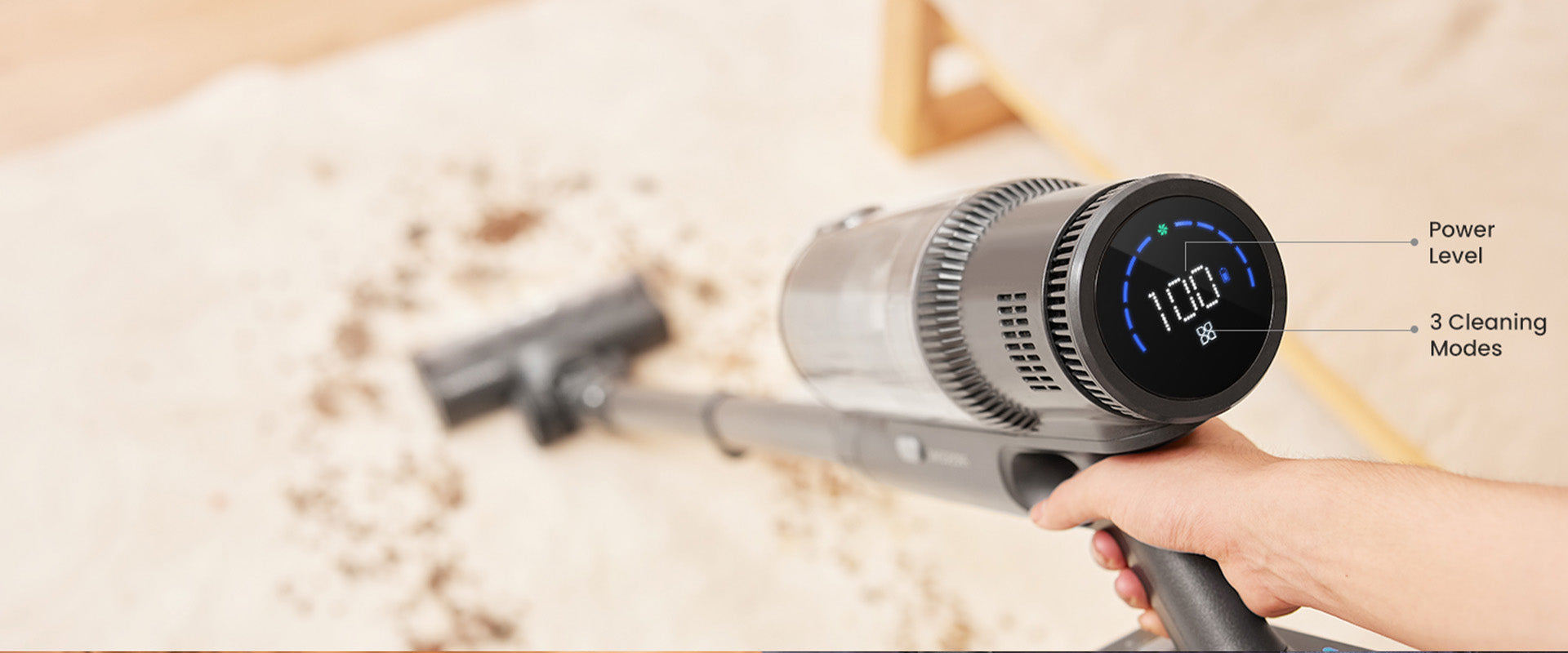 The onboard color LED display and touch panel show battery levels, cleaning modes, and error alerts—making every clean smarter and simpler.