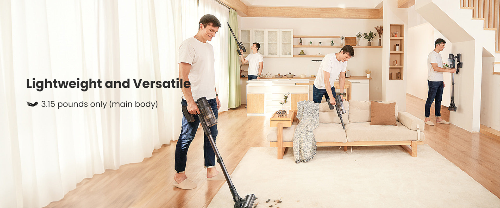 Easily converts to a handheld vacuum with adjustable length and versatile attachments for cleaning stairs, cars, and furniture. Weighing just 3.15 lbs, its ergonomic design and optimized weight distribution make whole-house cleaning effortless.