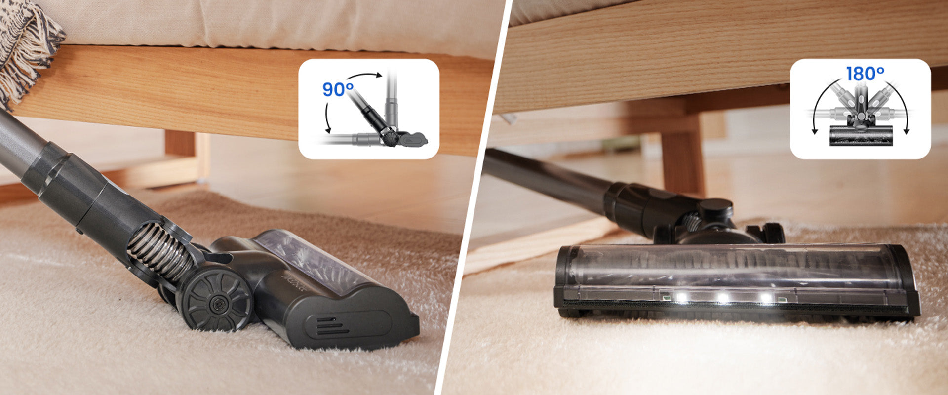 Lays flat and swivels 180°, allowing you to easily maneuver around obstacles and glide under furniture for a thorough clean.