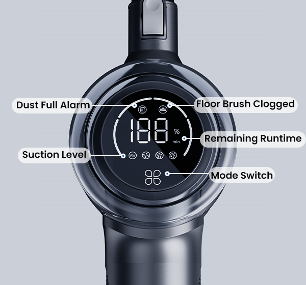 Displays current status, including selected power mode, remaining runtime (minutes), and maintenance alerts—giving you full control over your cleaning.