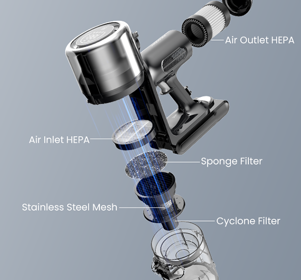 The five-layer sealed filtration system captures 99.99% of fine particles to 0.1um, expelling non-allergenic purified air.