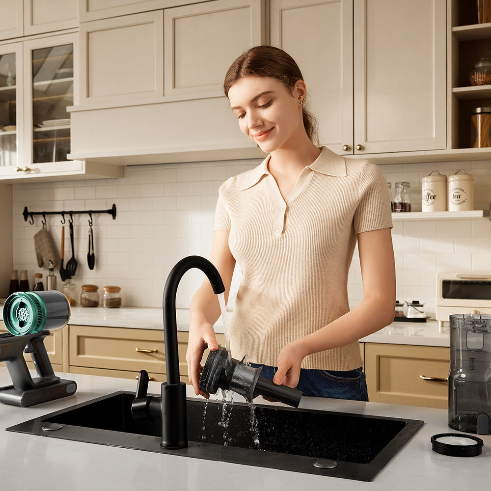 The 1L large dustbin empties in just one second with a single button press—no messy, repeated dumping.