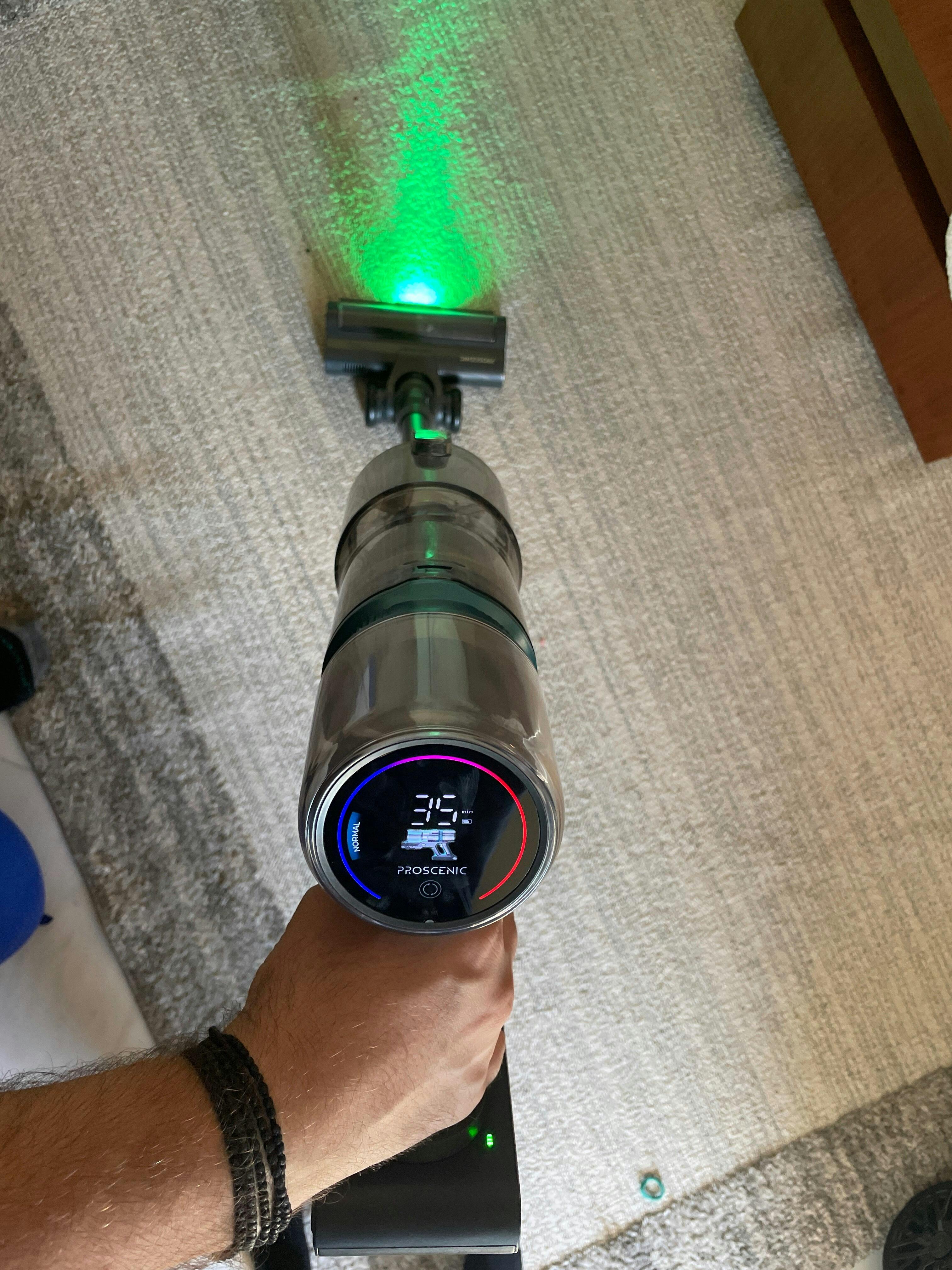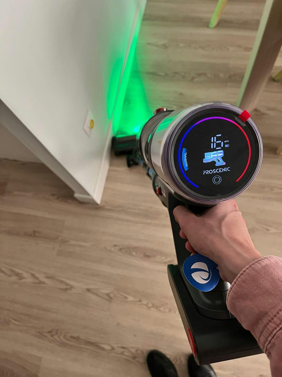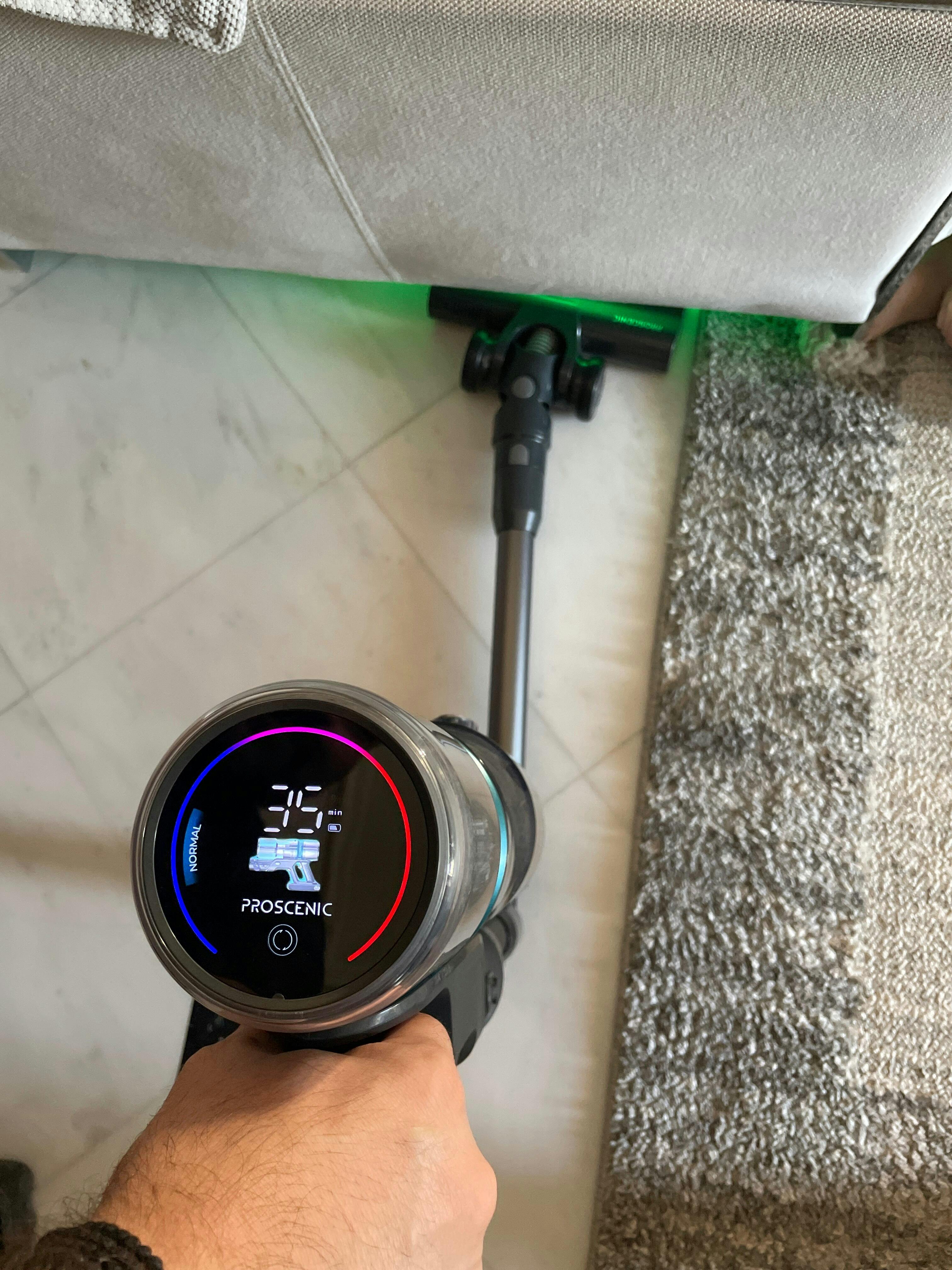 When using the mite removal brush, the P16 can run for up to 65 minutes on a full charge. With the floor brush attached, the maximum runtime is around 55 minutes. You can monitor the remaining battery time in real time on the device's display.